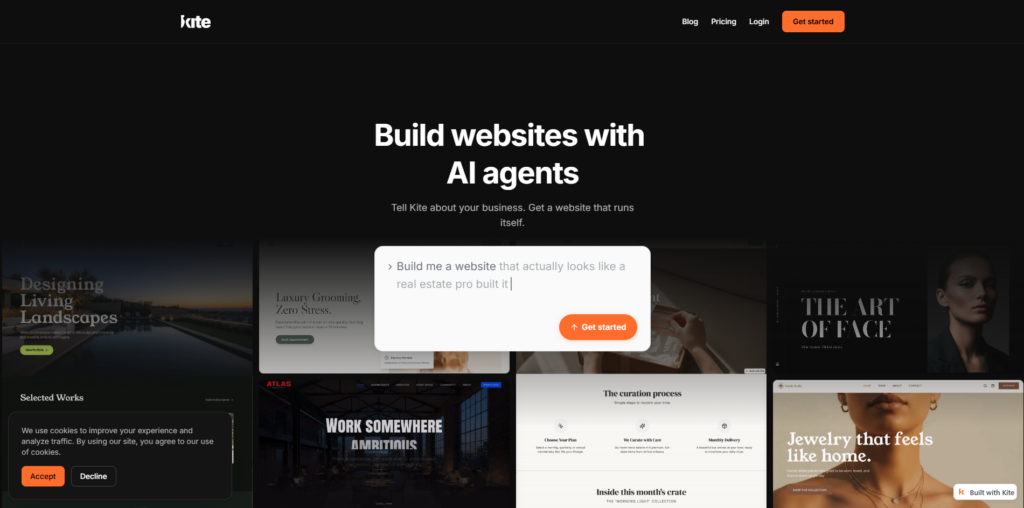 Kite is built for small business owners who want a professional website without touching a template or writing a single line of code. You describe your business in a short guided chat, and the AI generates three custom website designs to choose from.