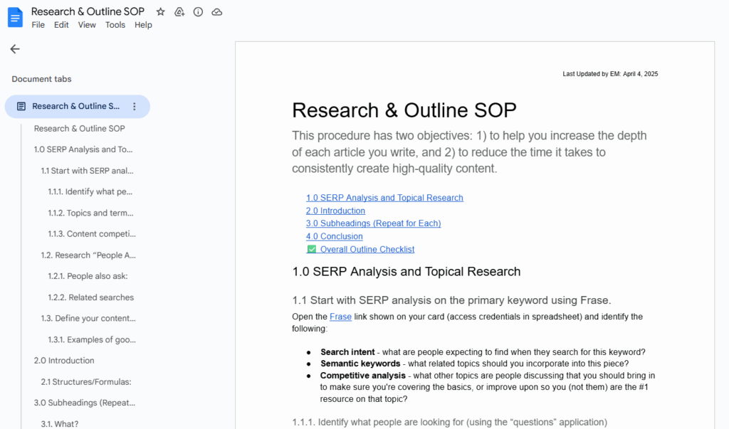 When creating SOPs and other project docs, make sure to use proper headings and formatting for easy scanning. This auto-creates a clickable outline to the left of the Google Doc for easier navigation.