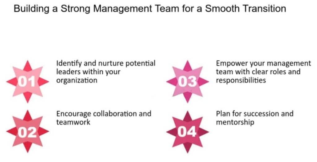 • Reduced daily involvement: Accept that your hands-on role will change. Delegate tasks in advance and gradually shift responsibilities to leadership.