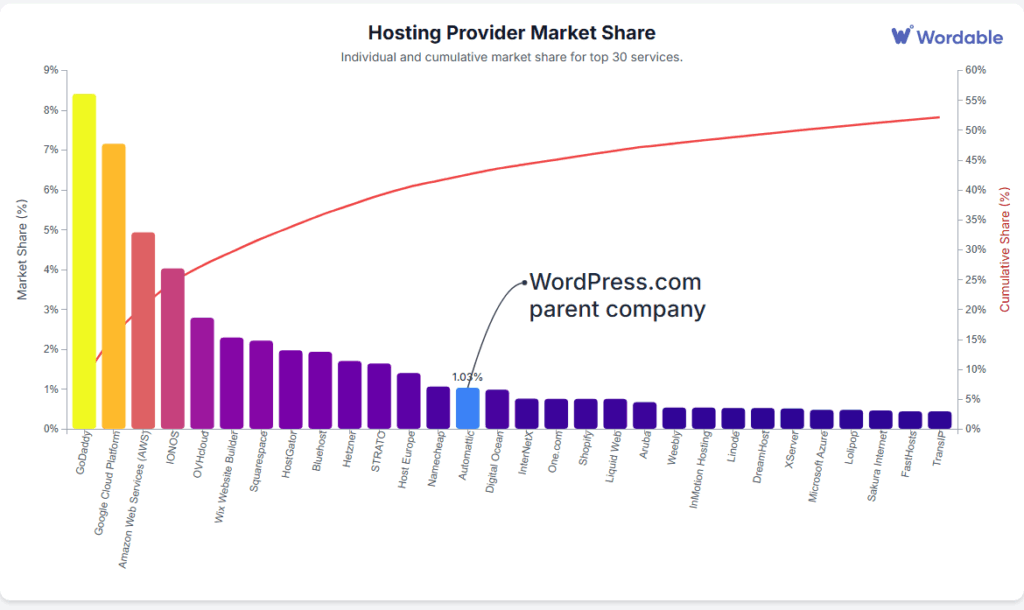 Though far from being the leading hosting provider on the internet, WordPress.com hosts 1.04% of all websites (source: HostAdvice).