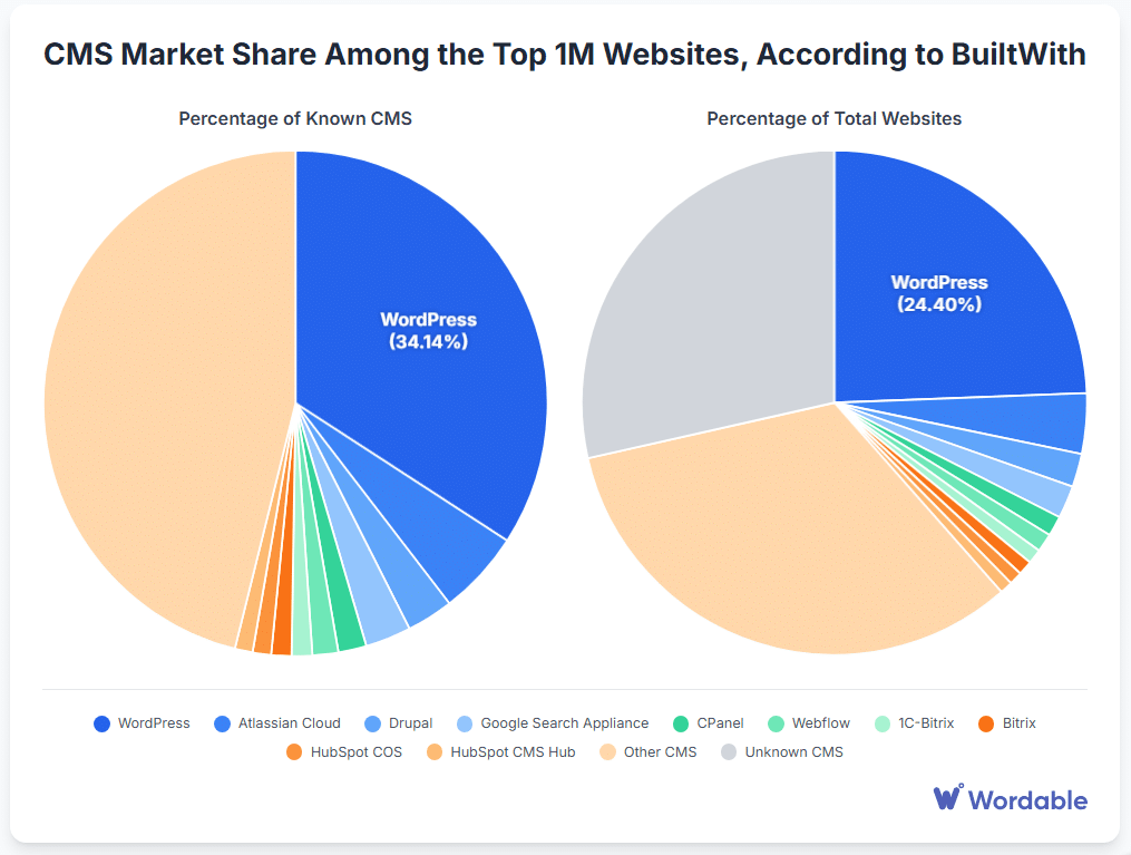 According to BuiltWith data, which covers 160 million websites, WordPress is the undisputed leader in the CMS space, accounting for 24.40% of all live websites and 34.14% of all active websites that use a CMS (many don’t).