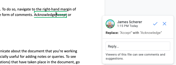 You can either accept or reject the suggestions. To do so, navigate to the right-hand margin of the document. You’ll see the suggestions in the form of comments. Accept or reject them.