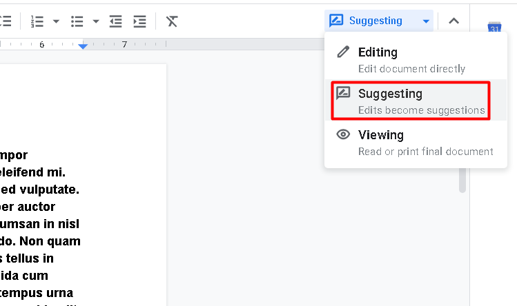 Inside your Google document, navigate to the upper-right corner of the screen. By default, it will say “Editing.” Click this menu, and you’ll see three options – Editing, Suggesting, and Viewing. Select the middle one. By accessing the Suggesting mode, you’ve successfully activated the Google Docs version of Track Changes.